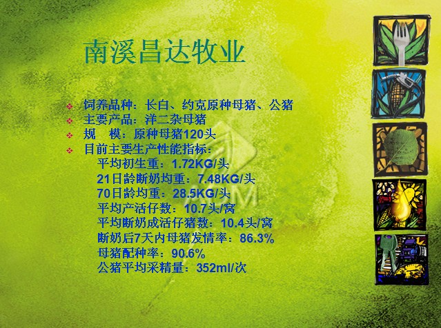 饲养品种:长白、约克原种母猪、公猪 主要产品:洋二杂母猪 规 模:原种母猪120头